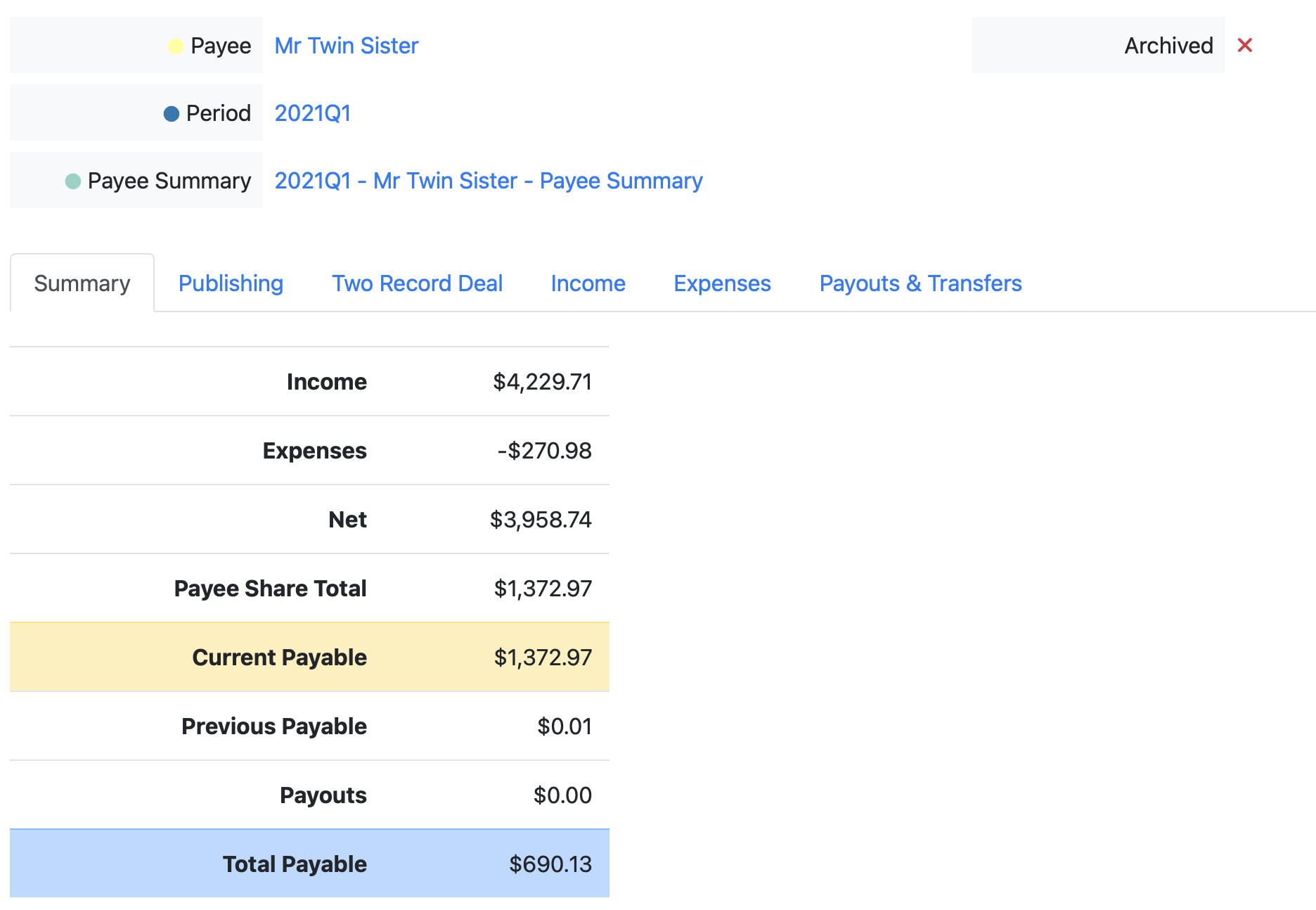 Payee Share Total: Total payee's share of the net for all releases and tracks, calculated by applying the Payee Split % for each balance upon net totals, broken down on each individual ledger tab