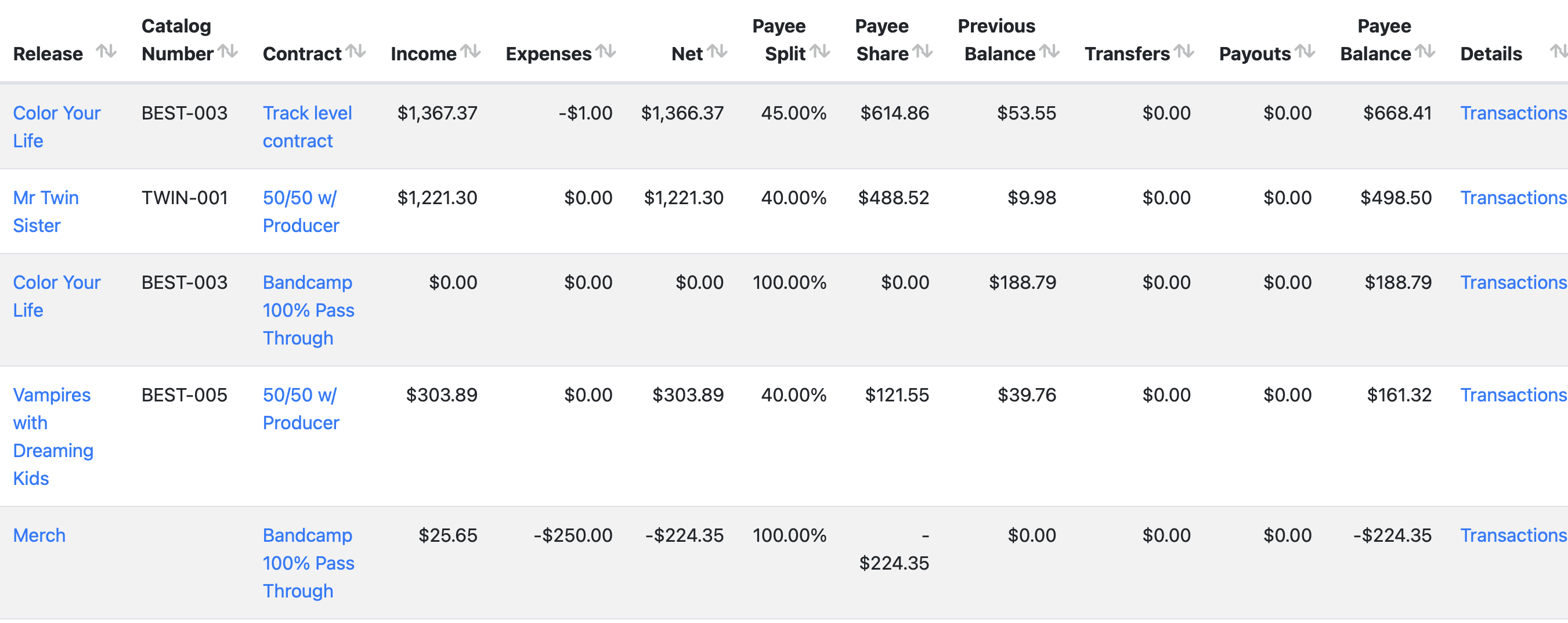 Each expense is itemized by Date, Release, and Category, with any additional information summarized in the Memo column in the Expense tab. The link in the Transaction column links directly to the expense transaction for each line. Please note: Expenses are listed in full, with their Payee Share %s calculated on the corresponding ledger.
