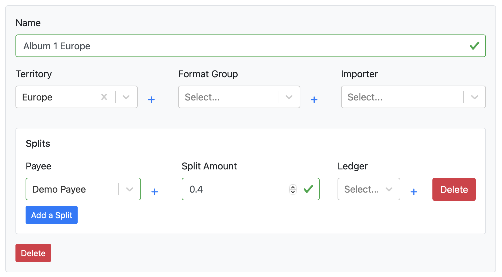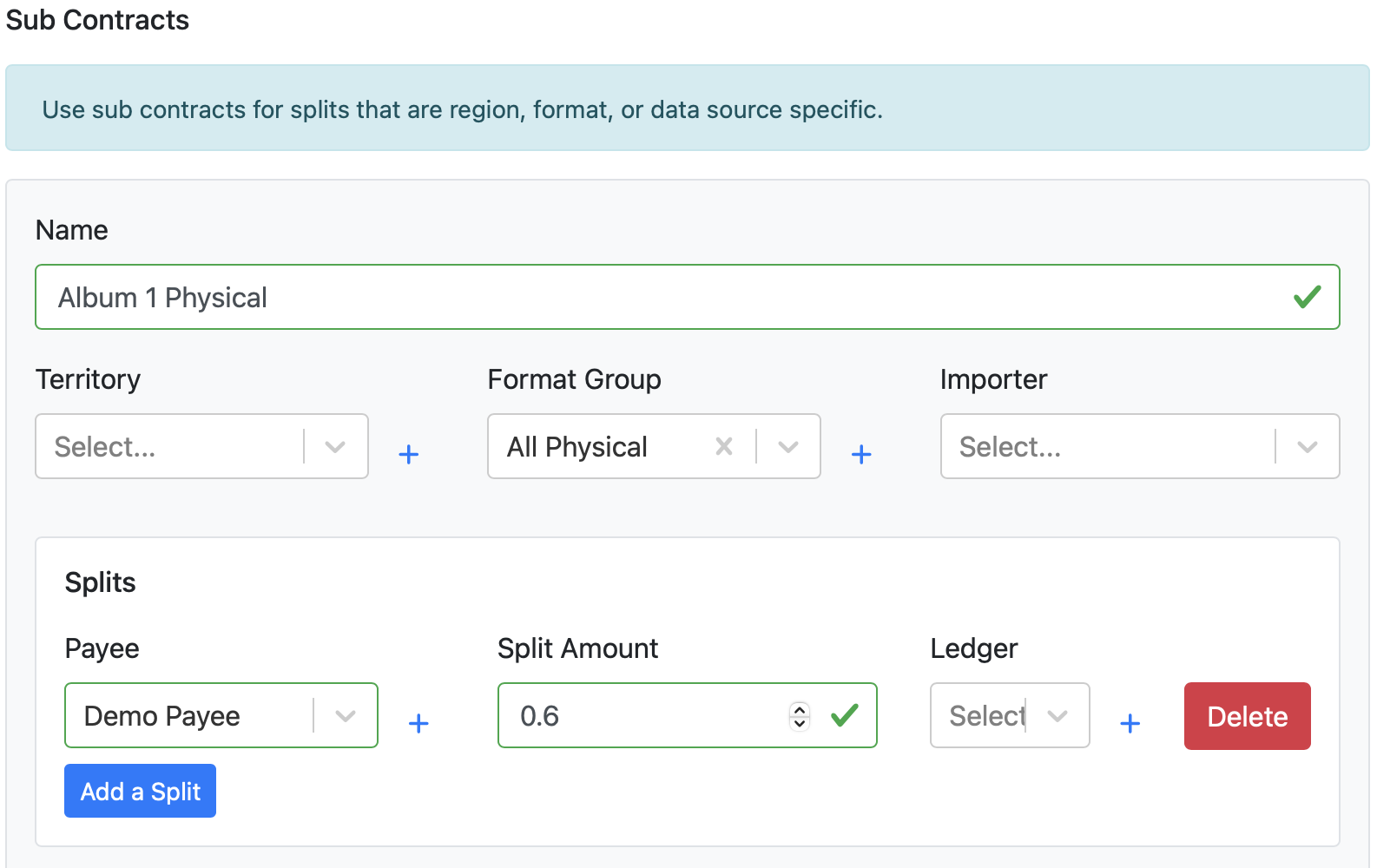 Sub Contracts allow a catalog to set up multiple sets of splits that will be used by Items (and their Transactions) depending on the Item's Territory, Format Group or Importer. This allows for catalogs to easily account for format, territory, or data source specific contracts, and reduces the need to assign Item-level contracts manually.
