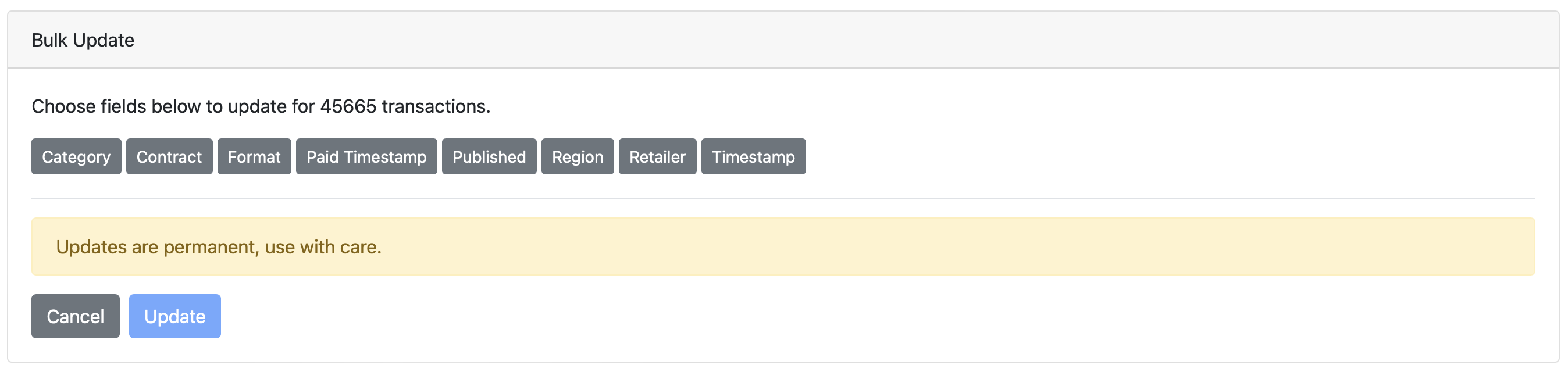 - Bulk Update - This action allows you to bulk update the Category, Contract, Format, Paid Timestamp, Published, Region, Retailer, and Timestamp values of the Transactions in the list view. You can use this action to Publish and Unpublish transactions, select a new Timestamp or Paid Timestamp for Transactions, and update other values of transactions in bulk.